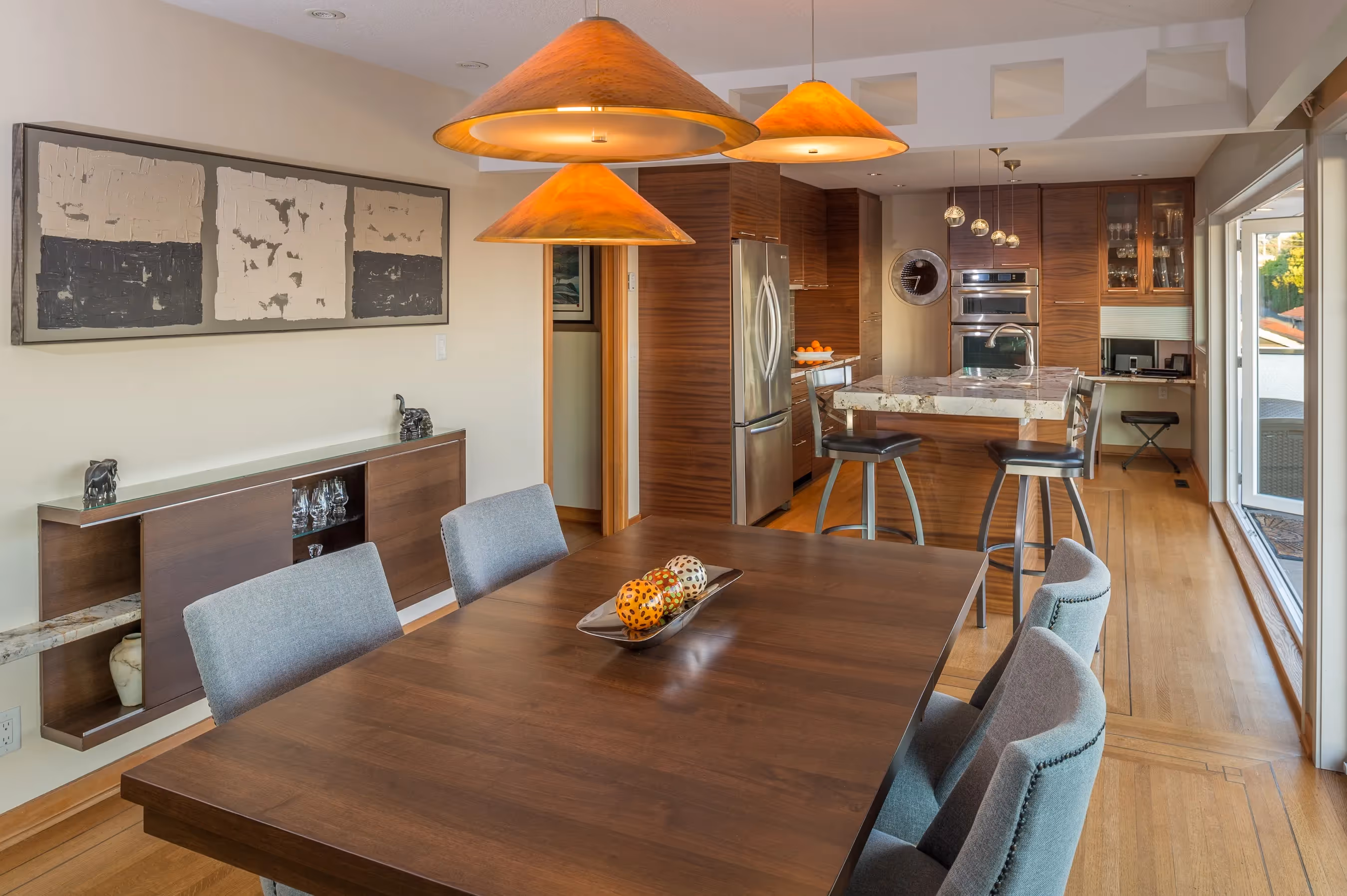 The client desired to preserve the heritage charm of this 1950s house while creating 21st Century, open-living flow. Emphasis was on pre-planning options for aging-in-place & integrating the outdoor living area ‘into’ the kitchen to enhance enjoyment of 180-degree views to the south. Considerations had to be made to create continuity with the well preserved ebony inlaid flooring in adjacent living/dining room.