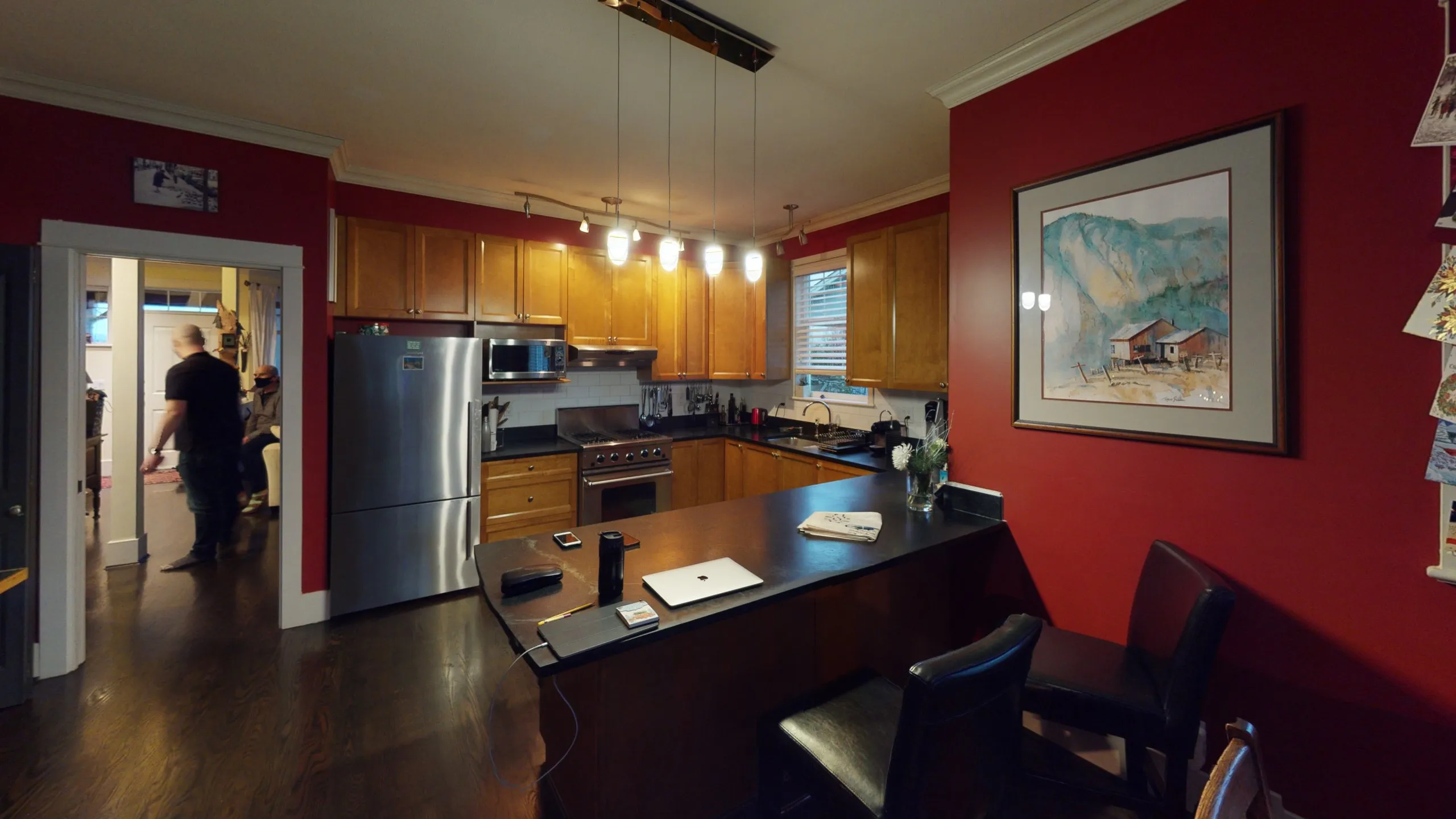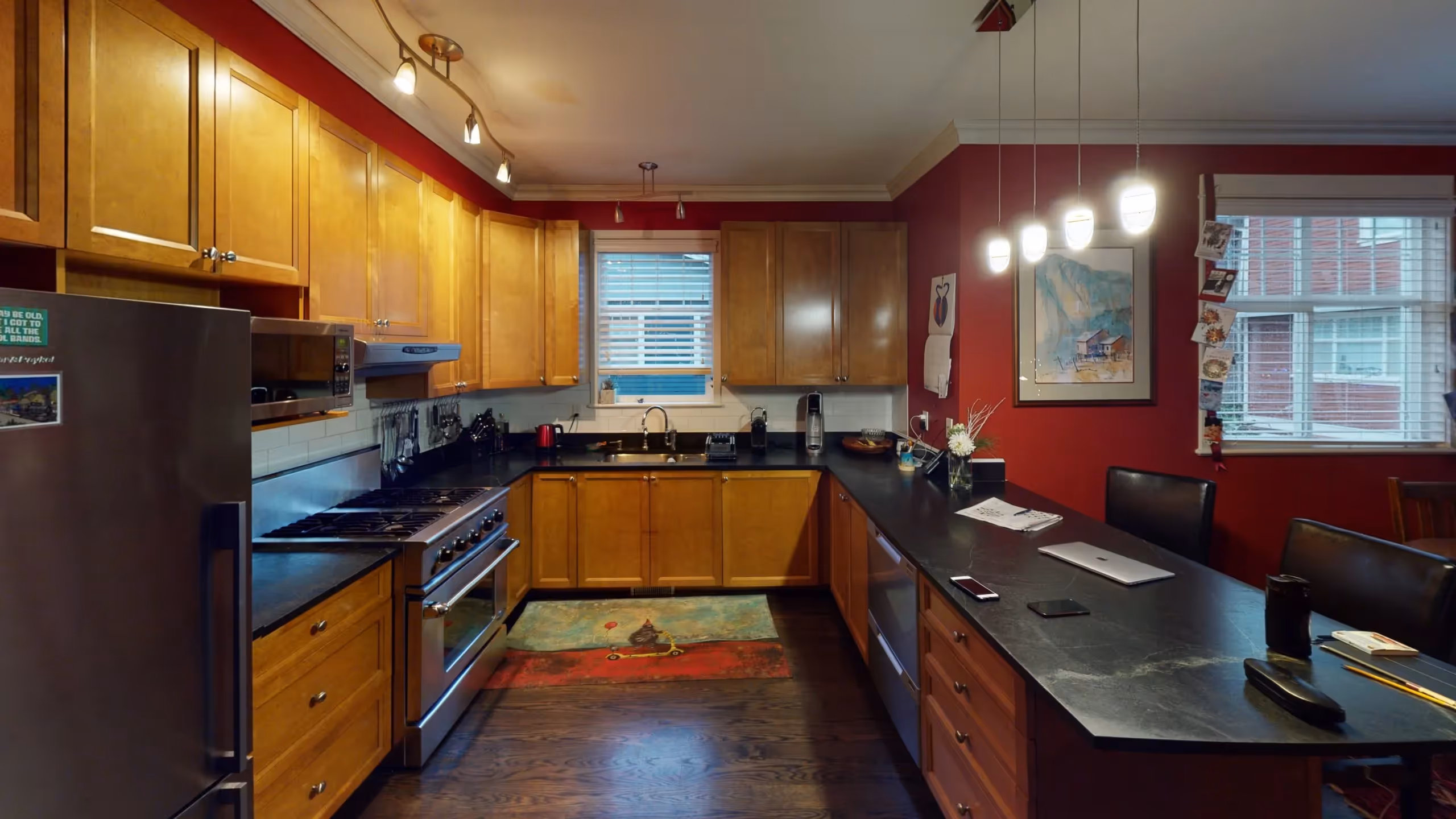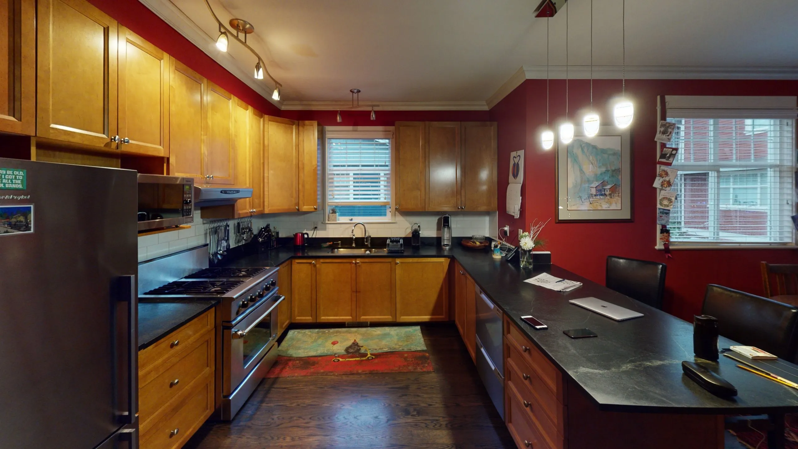 - Hood fan in ceiling has clean look, doesn’t obstruct view through pass-through