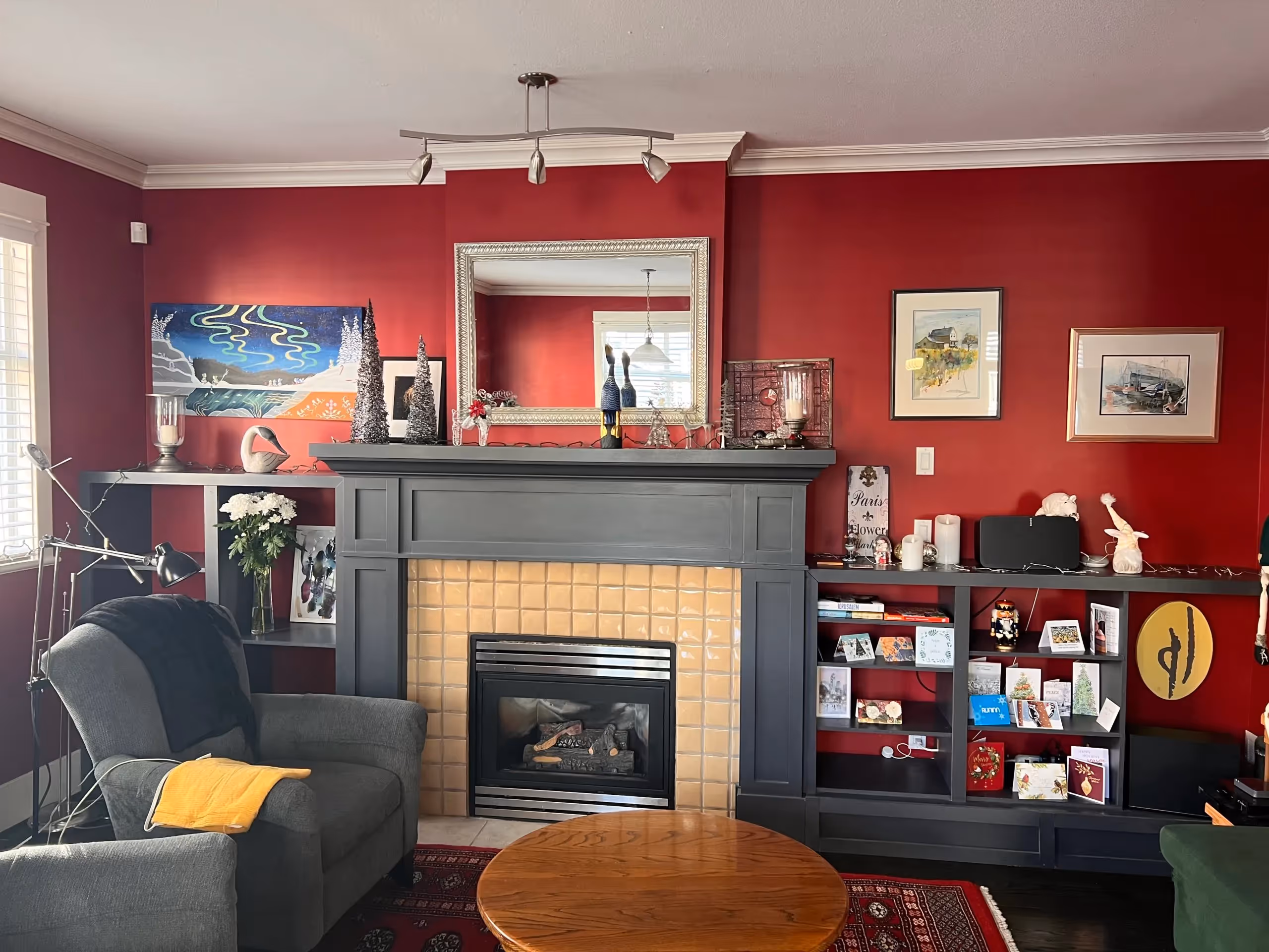 Old pantry was removed with newly designed 3 columns in new cabinetry wall – appears connected to fireplace wall but functions with kitchen. Free-standing freezer and 2 pantries (including skinny pullout) are cleverly concealed. Pendant lights frame island as workstation and entertainment-area.