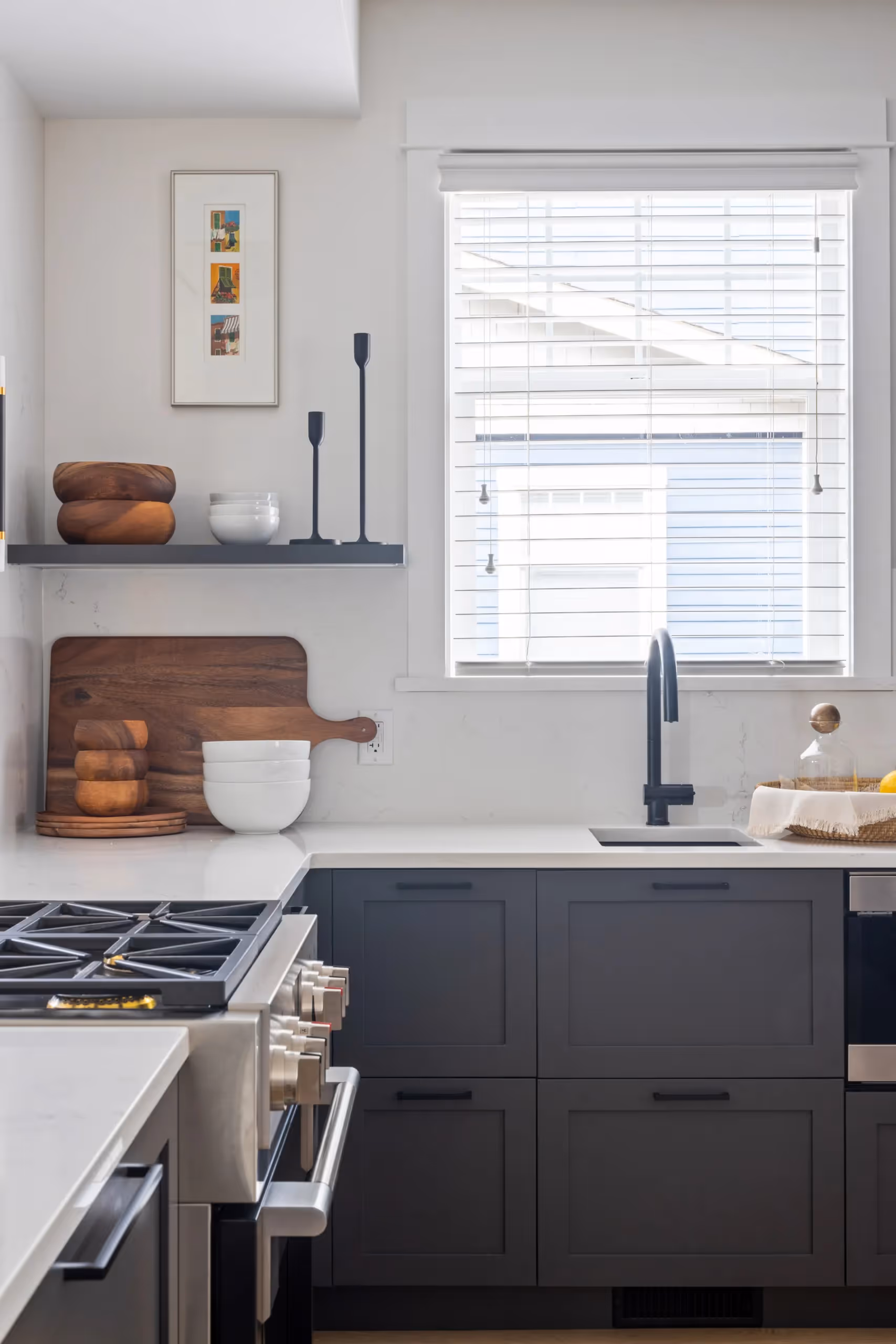 It was structurally not possible to remove the kitchen wall, so a pass-through was created to open the enclosed space. The kitchen’s layout was expanded by replacing the peninsula with a large island that includes a prep sink, which doubles as a bar sink. Range location remained, but workstations increased and relocated with a new hood fan recessed into ceiling above for unobstructed and enhanced sightline.