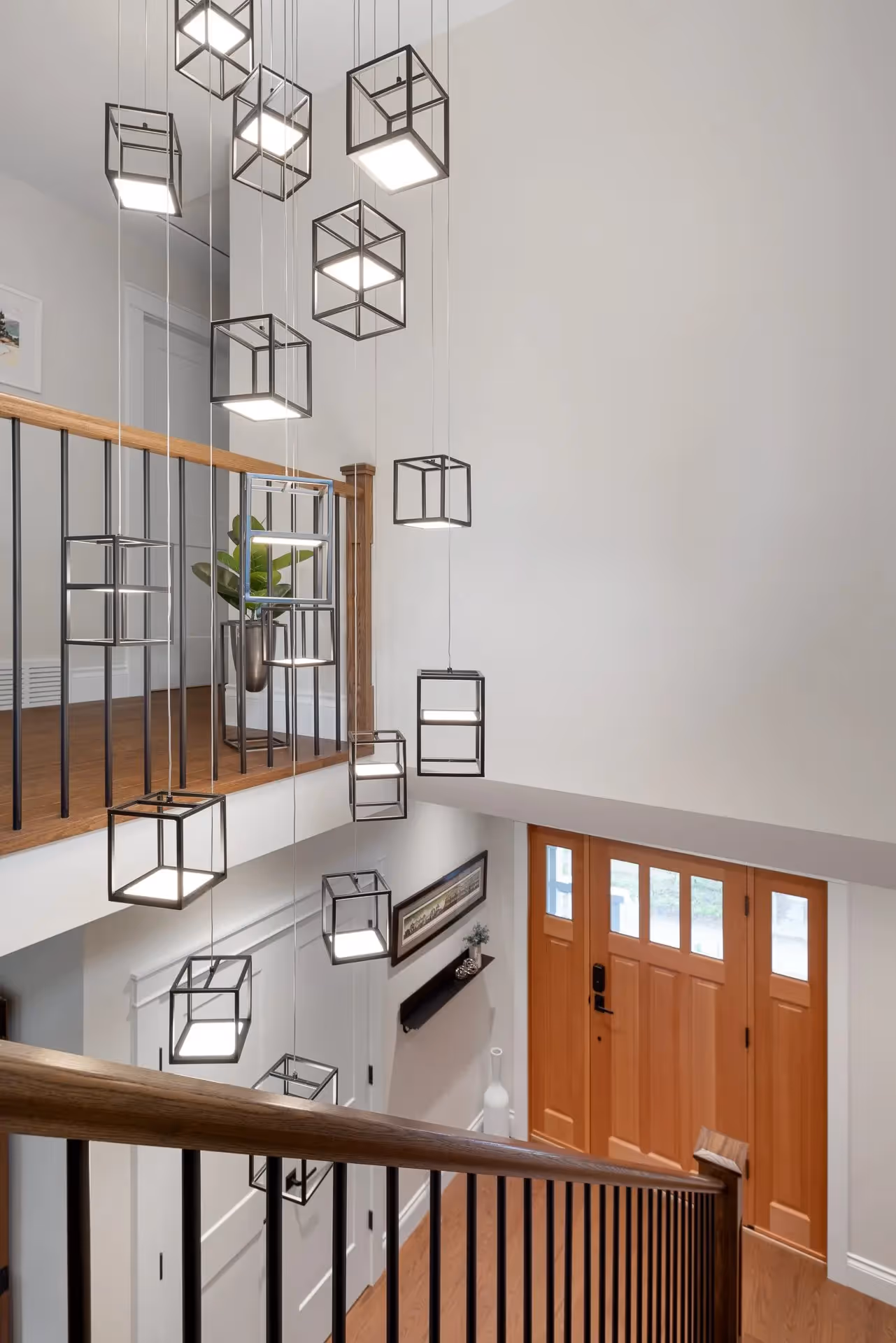 - Lighting: A staggered lighting fixture leads upstairs, serving as a focal point. The dining light, inspired by the silhouette of the West Coast mountains, includes crystals that illuminate, made from metal. The upper hallway features a metal plate that allows the light to flood out.
