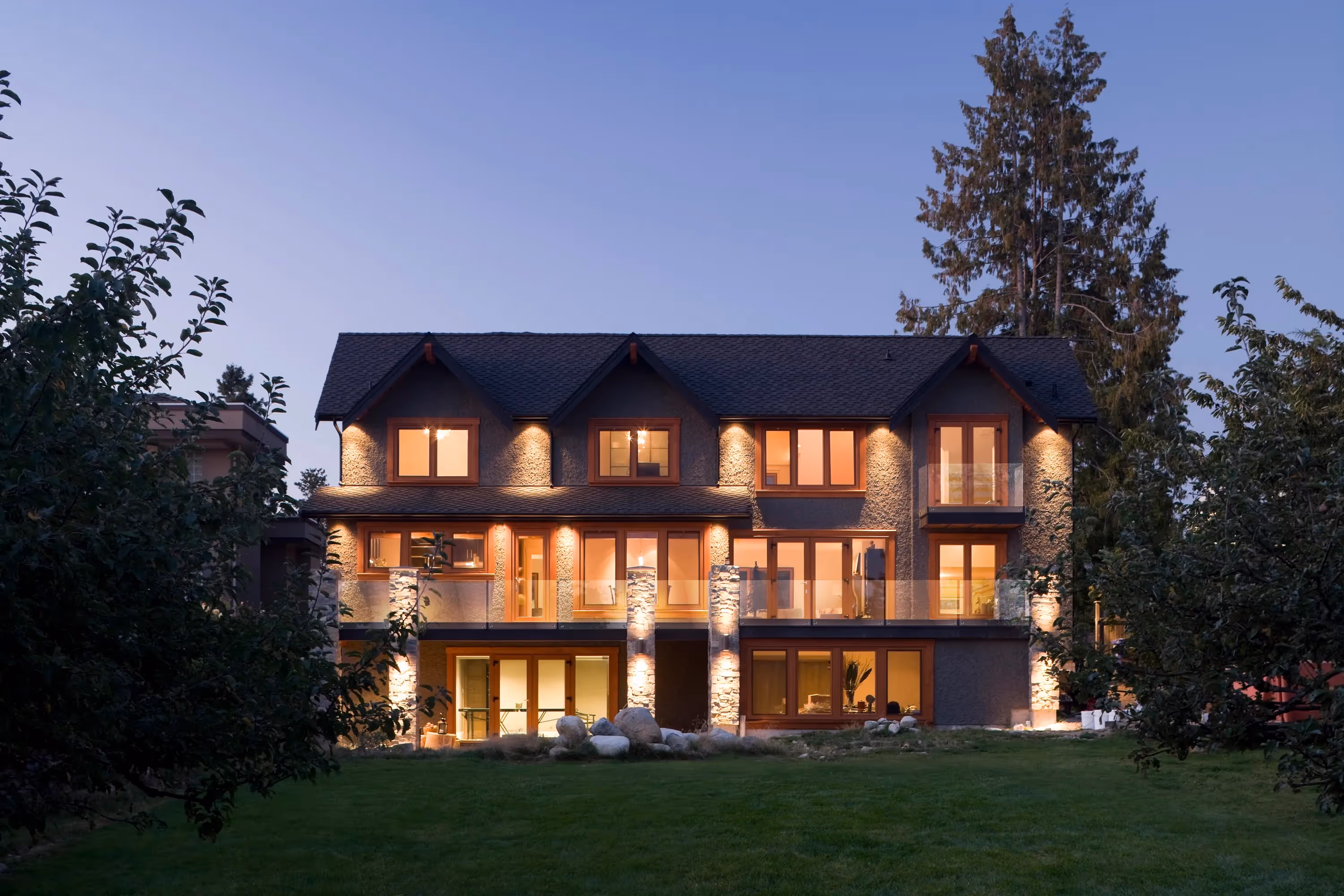 The existing second floor plate was undisturbed while additions were made, requiring flush reinforcing within the main ceilings. Extension over garage created for master suite and gives rear elevation a dramatic symmetry. Second floor substantially removed. Fir-clad, exposed beam, supporting building’s original rear wall, visually lengthens contours of now combined kitchen/dining room while providing rich, textural contrast to the millwork’s smooth, dark-stained finish. A large centre island with prep sink, built-in wine fridge, and casual barstool seating, becomes the room’s working hub; a gathering place for guests and family. New multi-gabled roofline, ledgestone accents, wood soffits and the chimney cap give a contemporary twist to traditional styling found throughout surrounding mature neighbourhood. The interior of the home received a more open dynamic through the removal of partitions and with the traffic flow now enhancing the entertaining spaces. The new layout encourages interaction among guests and provides easy access to the remodeled living room and new patios.
