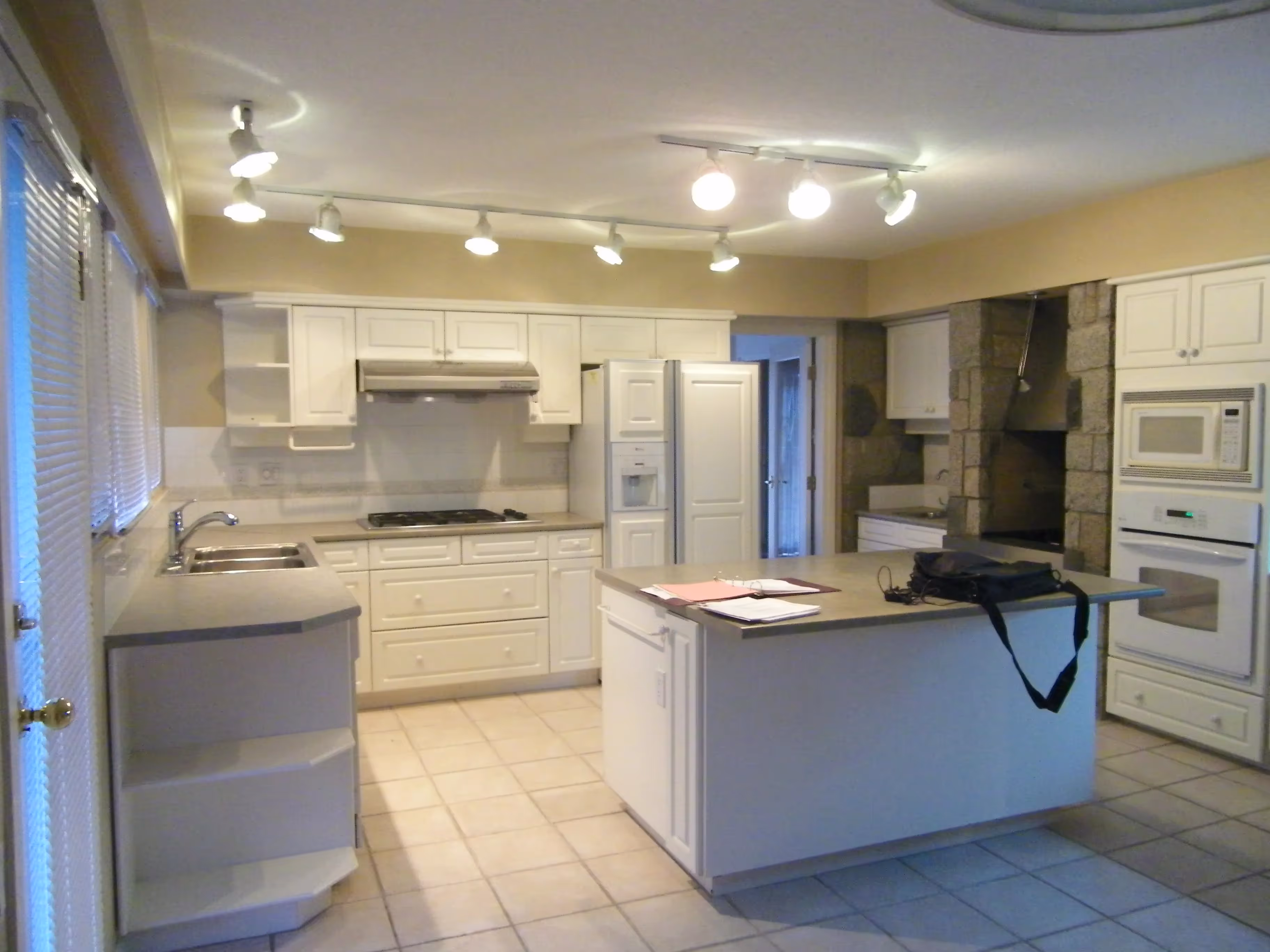 - Lit by overhead pots, and LED bulbs and strips under cabinet, under island, and bar lighting